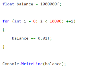When we add 0.01 to 1,000,000 ten thousand times, the result is 1,000,000. That won’t be so cool if this happens to be the balance of some rich guy, right?