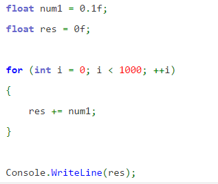 0.1 summed up 1000 times normally equals 100. But on my machine, after I run this code snippet it outputs 99.99905.