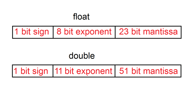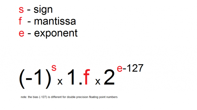So floating point numbers consist of the exact three things I mentioned earlier – sign, mantissa and exponent. These three parts are packed in a single spot in memory. The most common implementations of floating point numbers in programming languages use 32 bits (these are called single precision floating point numbers, also known as float) and 64 bits (called double precision floating point numbers or simply double).