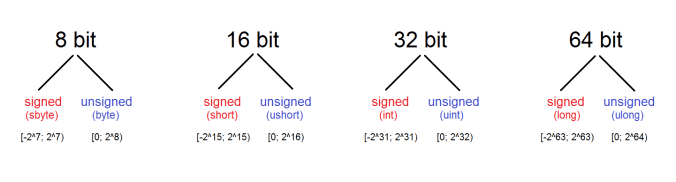 Another common outcome of the binary nature of numbers occurs when we want to represent negative values in an integer number. As mentioned in the negative binary numbers article, whenever we want to represent negative values, we use the leftmost bit to indicate whether the value is positive or negative. Due to that, we now have 7 bits left for the actual value of the number (For 8 bit numbers). Hence, we are left with 2^7, or 128 possible values for the positive part of the data type (but we should take into account the zero as well) and 128 values for the negative one. Therefore, every integer data type branches out to a signed and an unsigned variant. Unsigned types can represent positive values and zero. Signed types can represent both positive and negative values (and zero).