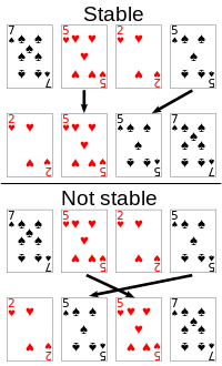 You have a data set of People objects and you want to sort it by age. You use a non-stable sort algorithm such as Quicksort. If in the initial data set, there is a James, who is before Charles and they have the same age, it is not guaranteed that their order will be preserver after applying the algorithm. In cases, in which this is a required constraint, a stable sort algorithm should be used. Among the fast algorithms, Merge sort is the only stable sort option. All of the slower sorting algorithms are stable sort (As long as you implement them that way).